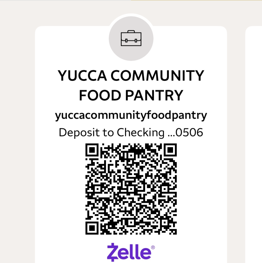 Please use this Email: [email protected] for our Zelle account to add us, as a recipient to donate to the Yucca Food Pantry.